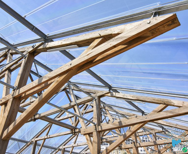 目前的主要木结构已得到维护和修复。除了这个原始结构外,在屋顶的两个斜坡和山墙的尖端还安装了另一个金属结构。这种结构用作安装 3 个拉伸透明 ETFE 单层膜的基础,带有钢缆、杆和原铝型材。